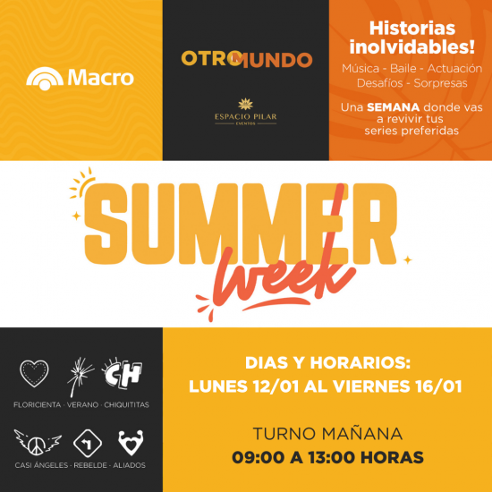 Este Verano Otro Mundo llega a Espacio Pilar, los invita a un programa único: Summer Week. Una semana entera donde vas a volver a vivir y ser parte de todas las historias de Cris. Con baile, canto, actuación y también juegos, sorpresas, dinámicas y mini shows.